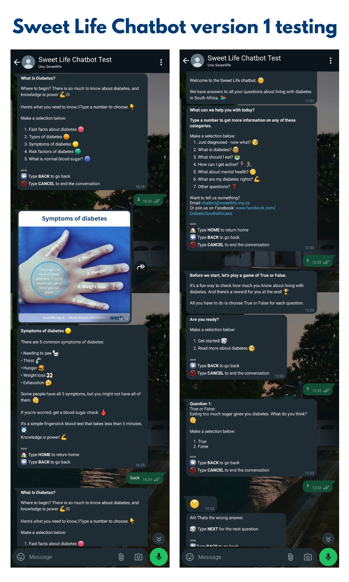 All the foundational diabetes educational materials that Sweet Life has developed thus far have been in collaboration with our panel of diabetes experts and endorsed by SEMDSA (the Society for Endocrinology and Metabolism in South Africa). All materials are also submitted to the National Department of Health NCD Department for review, with any feedback incorporated into later versions. We have also worked closely with Dr. Kibachio Joseph Mwangi, the Medical Officer and Advisor for Non Communicable Diseases and Mental Health; World Health Organization (WHO) South Africa, to ensure our diabetes education focus is aligned. In addition, we believe that the power of behavioural change is essential to any education project. We assess any educational materials with behavioural scientist Dr Brendan Maughan-Brown, who has worked extensively in the HIV education space, to ensure that we are looking at education through a behavioural change lens. The strategy for monitoring a project that seeks to impact the quality of life, wellbeing, but also the ease of accessing information to empower individuals and groups requires a mixed methods approach to both quantitatively and qualitatively understand and integrate our offering more effectively. With the project objectives in mind, this will include two main elements that guide our product development: 1) User experience, and 2) Platform refinement. Questions will be framed around the themes detailed below, and provide quantitative data to analyse, with qualitative data collected to gain further insights into the user’s ratings. This will be collected through: - A baseline survey for feedback groups, and as many additional users as possible. - Feedback collected via feedback drive survey and data driven engagement. - Consistent feedback from a group of recurring users, spread throughout the country: this will include agreed upon timelines for collecting feedback, and mobile data to complete the surveys will be provided. - Our network of dieticians, doctors and nurses to complete bi-annual feedback: this will include agreed upon timelines for collecting feedback. - Feedback channel that is available to users, using the email address provided via the chatbot menu. - Consistent feedback through the WhatsApp chatbot platform (to highlight missing information) and through Sweet Life’s online diabetes community. - The option to discuss their experience can also be scheduled within the feedback collection process every six months. 1) User experience, evaluating impact This element explores our understanding of the user; what kind of support they need from a tool like this, what they care about in regards to diabetes care and management, and how the tool can better aid them in meeting these needs. It can also explore how the tool has changed their management and lifestyle, mindset and view of diabetes. Questions will be asked using a rating scale (“On a scale of 1 to 5, how useful did you find the Sweet Life Chatbot?”), with an accompanying prompt to gain insight (“What is your reason for your rating?”). 2) Platform refinement, measuring effectiveness This element explores the value of our offering using the components that make up the platform; the relevance of the content, the usability of the tools and the levels of engagement on the platform. Questions will be asked using a rating scale (“On a scale of 1 to 5, how likely would you be to recommend the Sweet Life Chatbot”), with an accompanying prompt to gain insight (“What is your reason for your rating?”). With consistent questions throughout feedback, we will build the net promoter score (NPS) for the project offering, aiding in not only our understanding of the impact that the tool has on the user’s understanding of diabetes, their ability to make informed decisions about self-management and lifestyle choices, but also measuring the effectiveness of the presentation, navigation and comfortability of the tool. These insights help us assess and improve on the experience of the user with their own suggestions and comments. Further to this, surveys will be as short as possible (5-10 minutes) to reduce potential survey fatigue. Feedback users will be selected using the following list: - Using the engagement facilitated by the feedback drive that will happen during the pilot phase of implementation, an offer to provide further and continuous feedback will be given to the participants. This will help to reach a geographically widespread group to provide feedback. - An offer to provide further and continuous feedback will be given to the pilot group users to track the usefulness of changes. - A similar ratio of people with lived experience of Type 1 and Type 2 diabetes will be included. - Healthcare workers will be included in the feedback groups - Details on the feedback users will be collected to understand any differences or similarities in different contexts. This will be tracked through age, gender, connection to the diabetes community, type of residence (rural, peri-urban, urban), and their expectations.