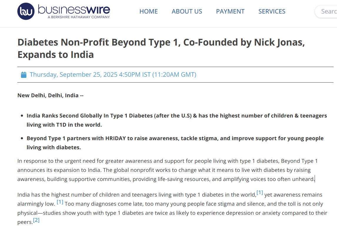 India Ranks Second Globally In Type 1 Diabetes (after the U.S) & has the highest number of children & teenagers living with T1D in the world. Beyond Type 1 partners with HRIDAY to raise awareness, tackle stigma, and improve support for young people living with diabetes.