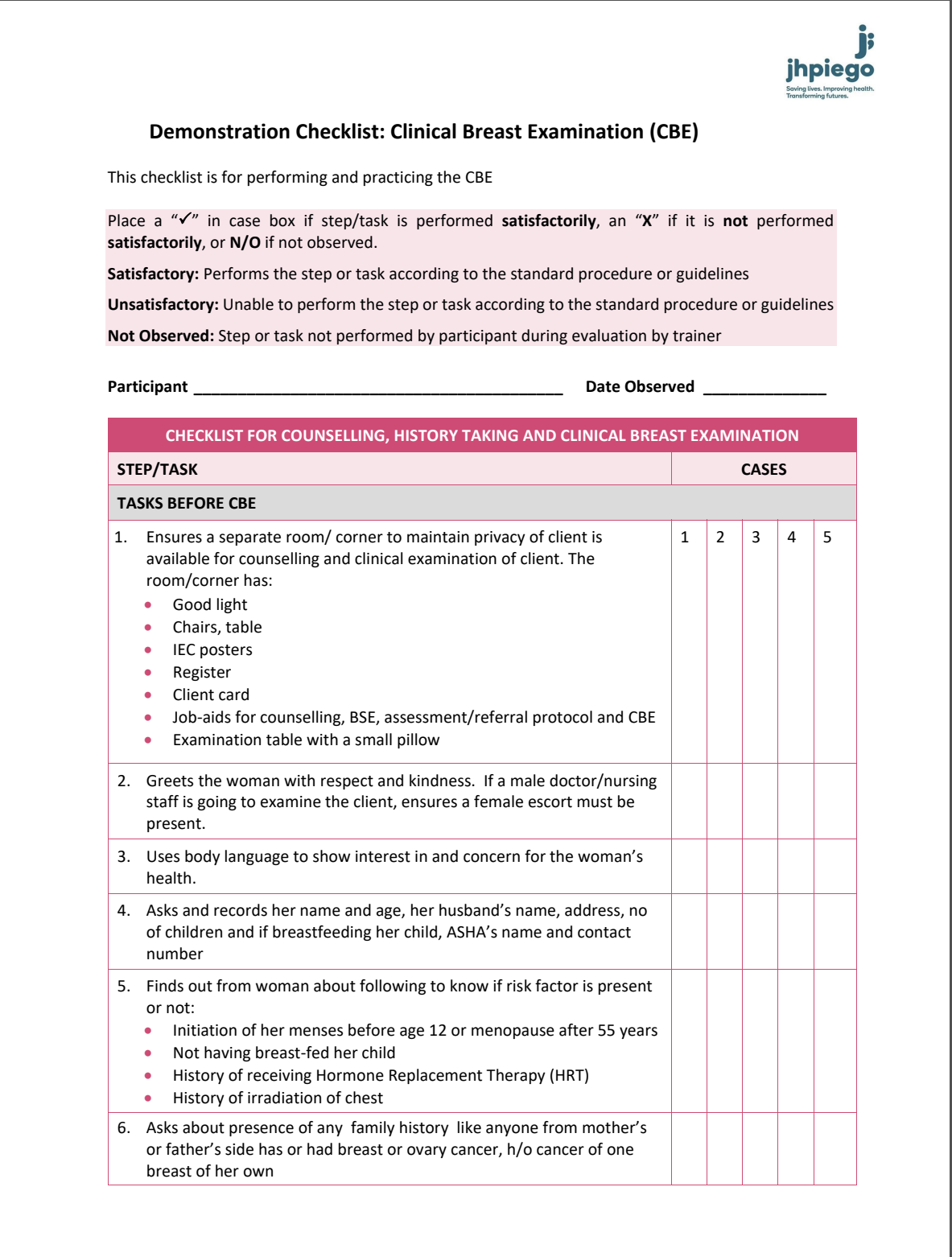 This checklist is for performing and practicing the CBE by JHPIEGO