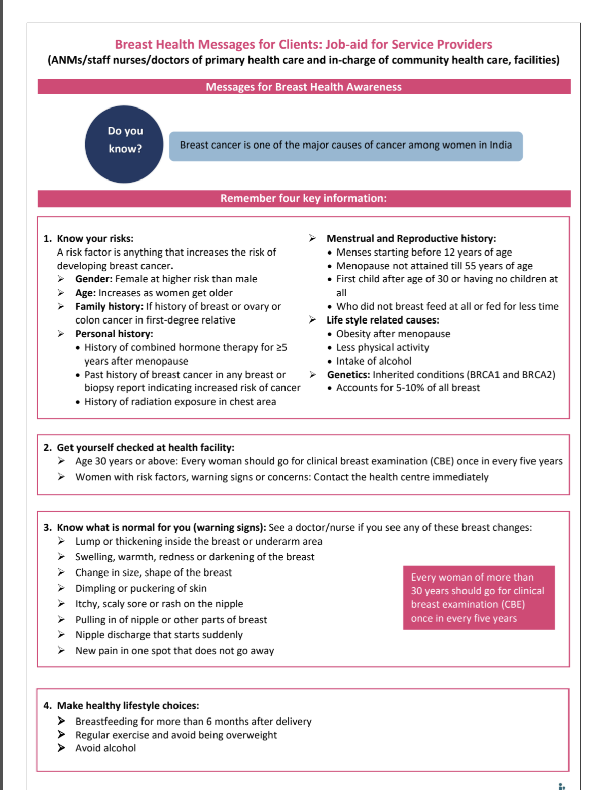 Messages for Breast Health Awareness for ANMs/staff nurses/doctors of primary health care and in-charge of community health care, facilities
